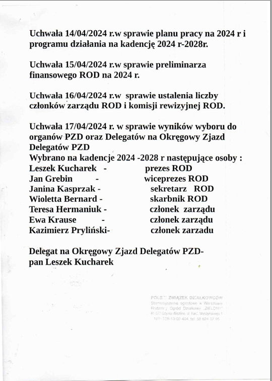 - w sprawie wyników wyborów do organów PZD w ROD ”Zielony” oraz Delegatów na Okręgowy Zjazd Delegatów PZD – jednogłośnie
